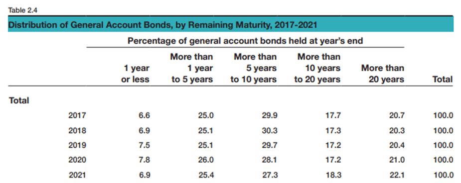 - Table 2.4 provided aggregate information on the maturity profile of general account bonds. More than 20% of the bonds had remaining maturities in excess of 20 years.